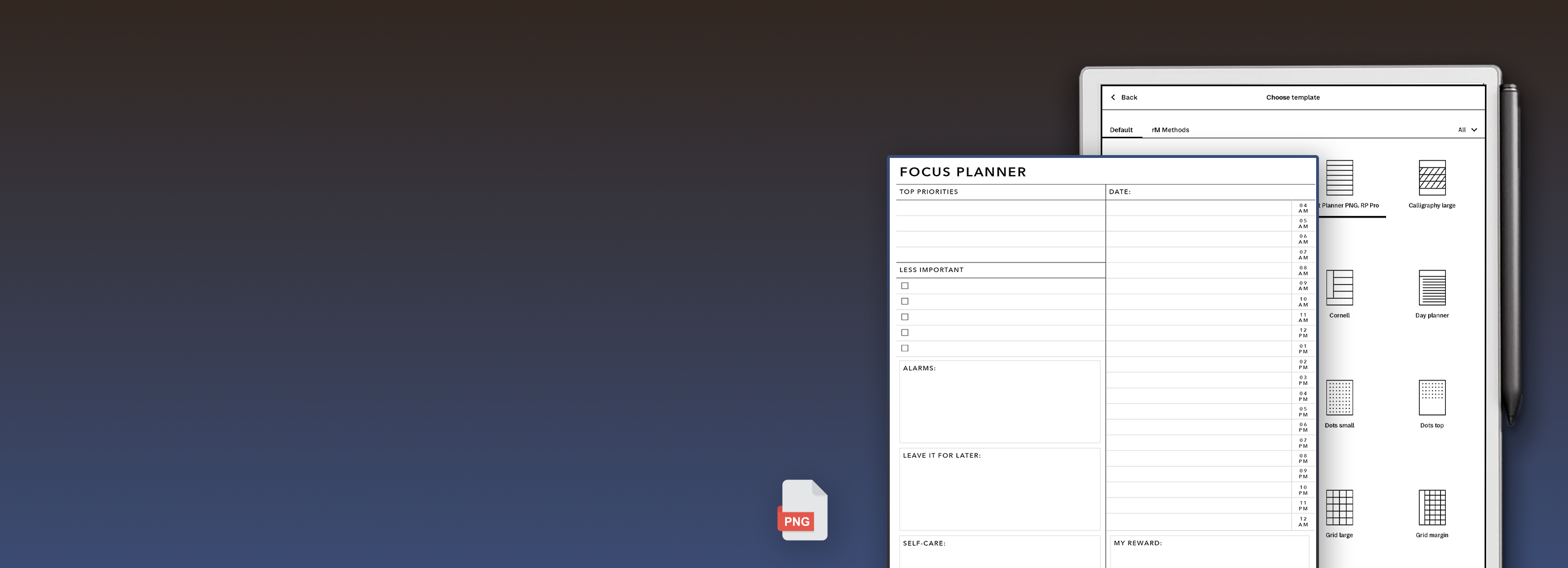 Upgrade your reMarkable with our exclusive digital templates for planning, note-taking, and creativity. Download an app below to install them natively on your device.