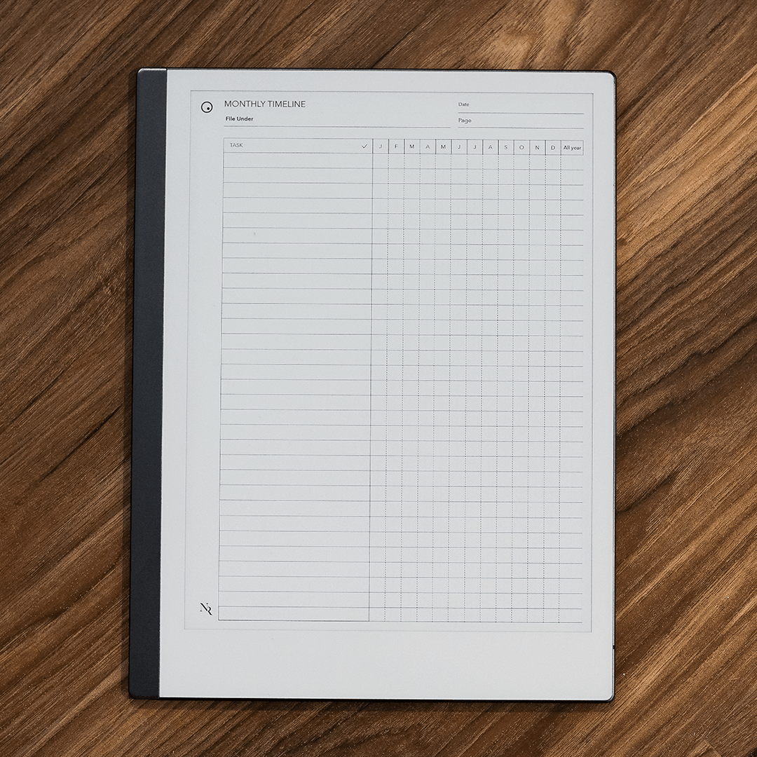 A PDF functions like a multi-page notebook, typically featuring fixed navigation. This means you cannot add custom templates to additional pages after creation. In contrast, PNGs serve as templates for alternating page backgrounds throughout your notebook, offering more flexibility to build it according to your needs. PDFs can be imported using the app available at remarkable.com, while PNGs need to be installed using either the Template Installer App or our Desktop Manager App (Binder).