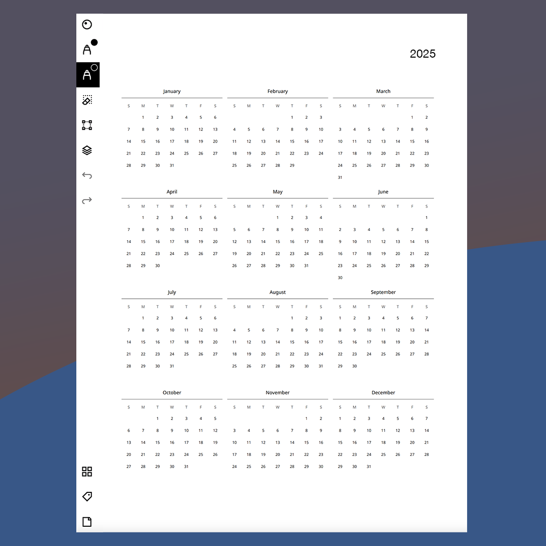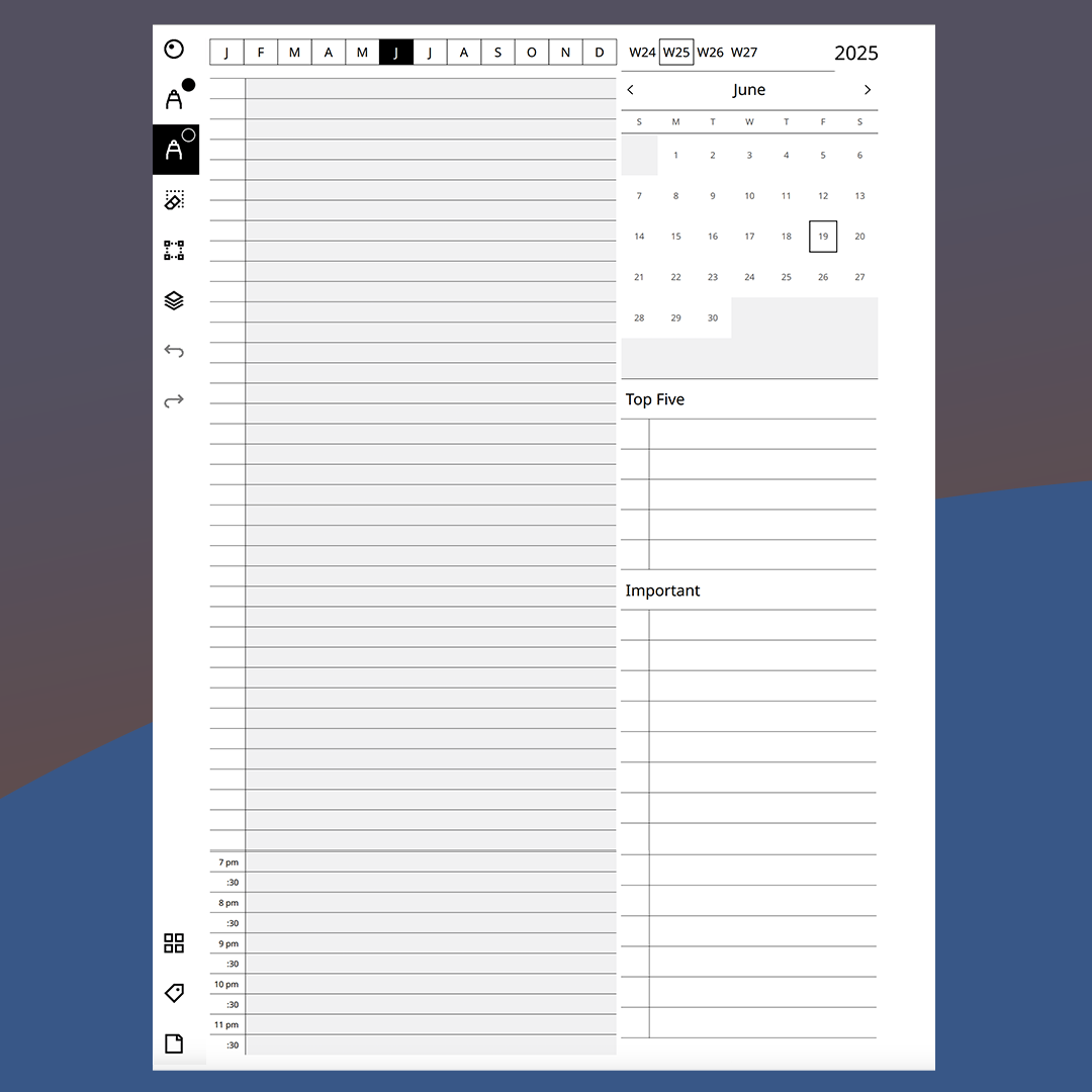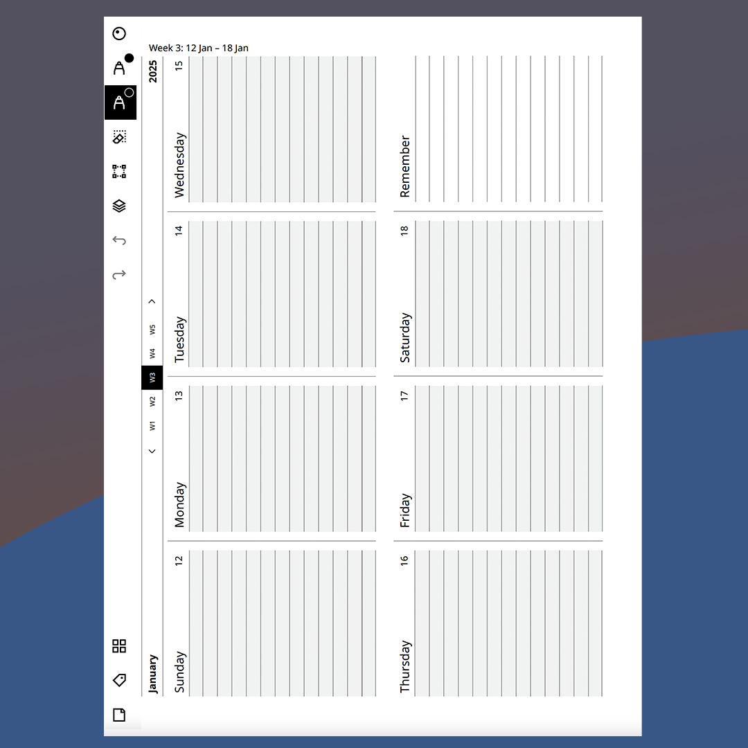 Verhoog je productiviteit in 2025 met deze krachtige planner – een beter alternatief voor de reMarkable Method-werkboeken. Deze PDF-planner is beschikbaar in 6 talen en is aangepast aan regionale kalenders. Hij begint op de juiste weekdag en bevat een klikbaar jaaroverzicht. Profiteer van vloeiende maandnavigatie vanuit de dagweergave, een brede kalenderindeling voor je evenementen en tijdsblokken voor een complete dagelijkse planning.
