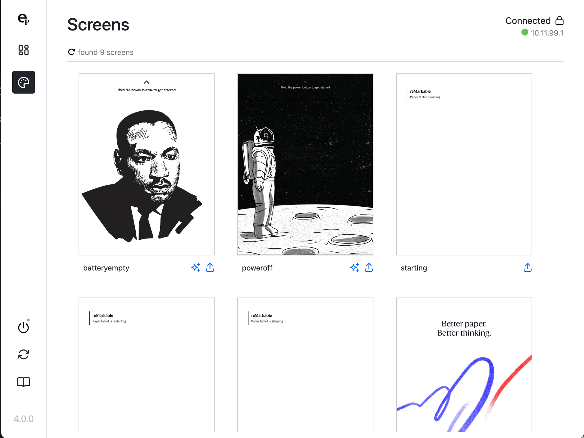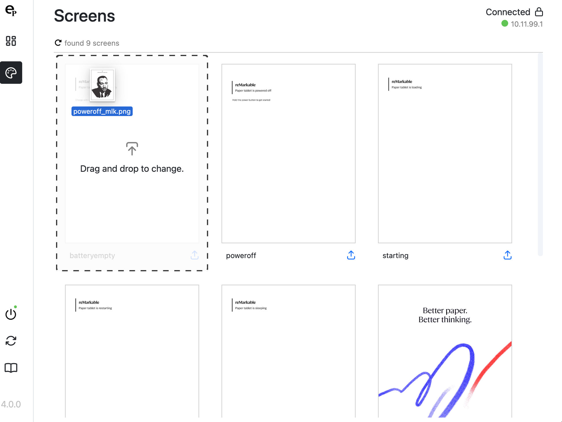 Pas het uiterlijk van uw reMarkable tablet aan. Verander het opstartscherm en alle andere schermen met eenvoudig slepen en neerzetten. Geef uzelf volledige creatieve controle over uw reMarkable tablet. Personaliseer uw apparaat moeiteloos met slechts een eenvoudig slepen en neerzetten, vanaf uw opstartscherm en verder.