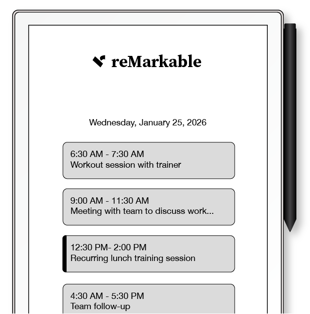 Your daily calendar events are summarized and displayed on your reMarkable’s sleep screen, keeping your schedule visible even when your tablet is asleep.