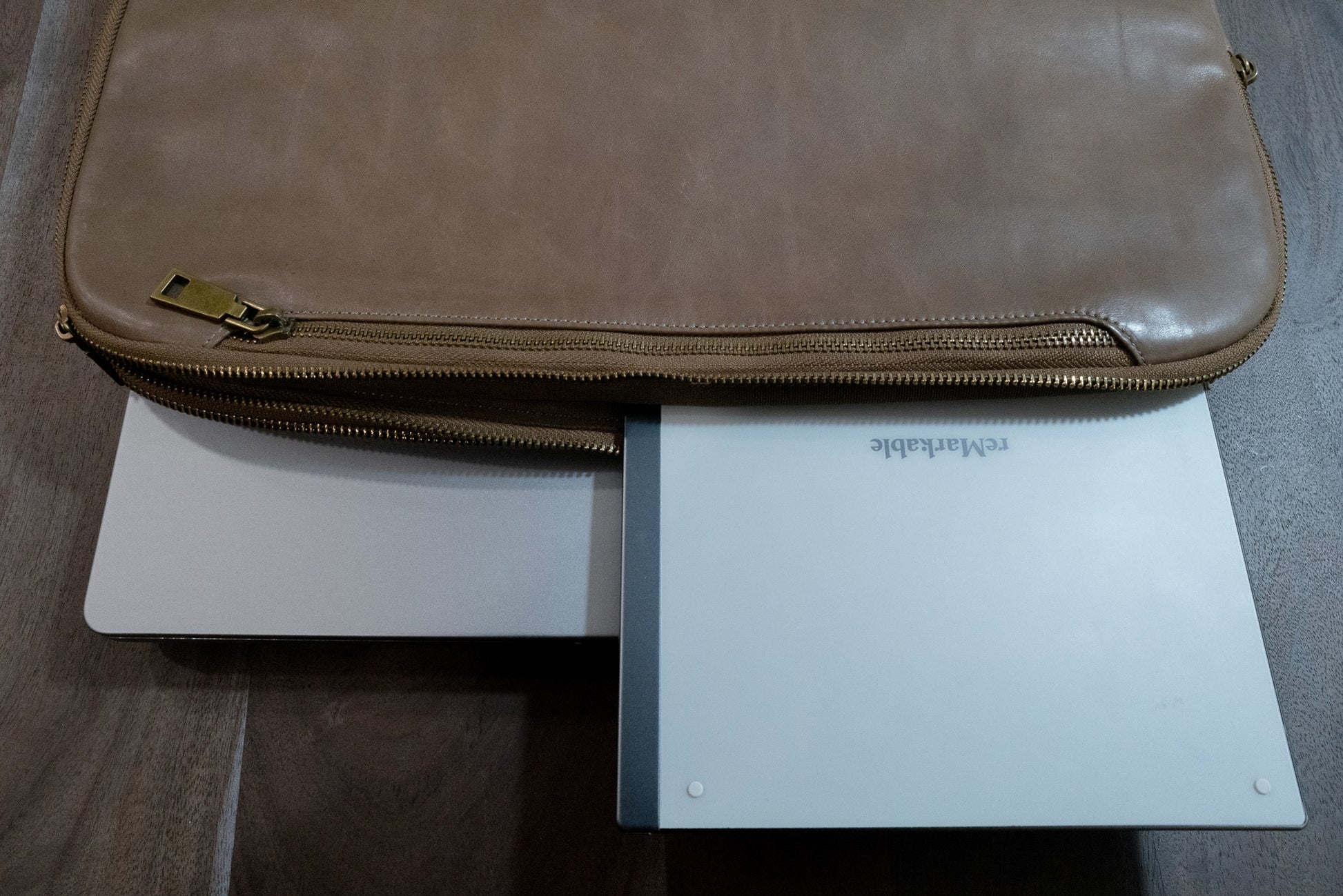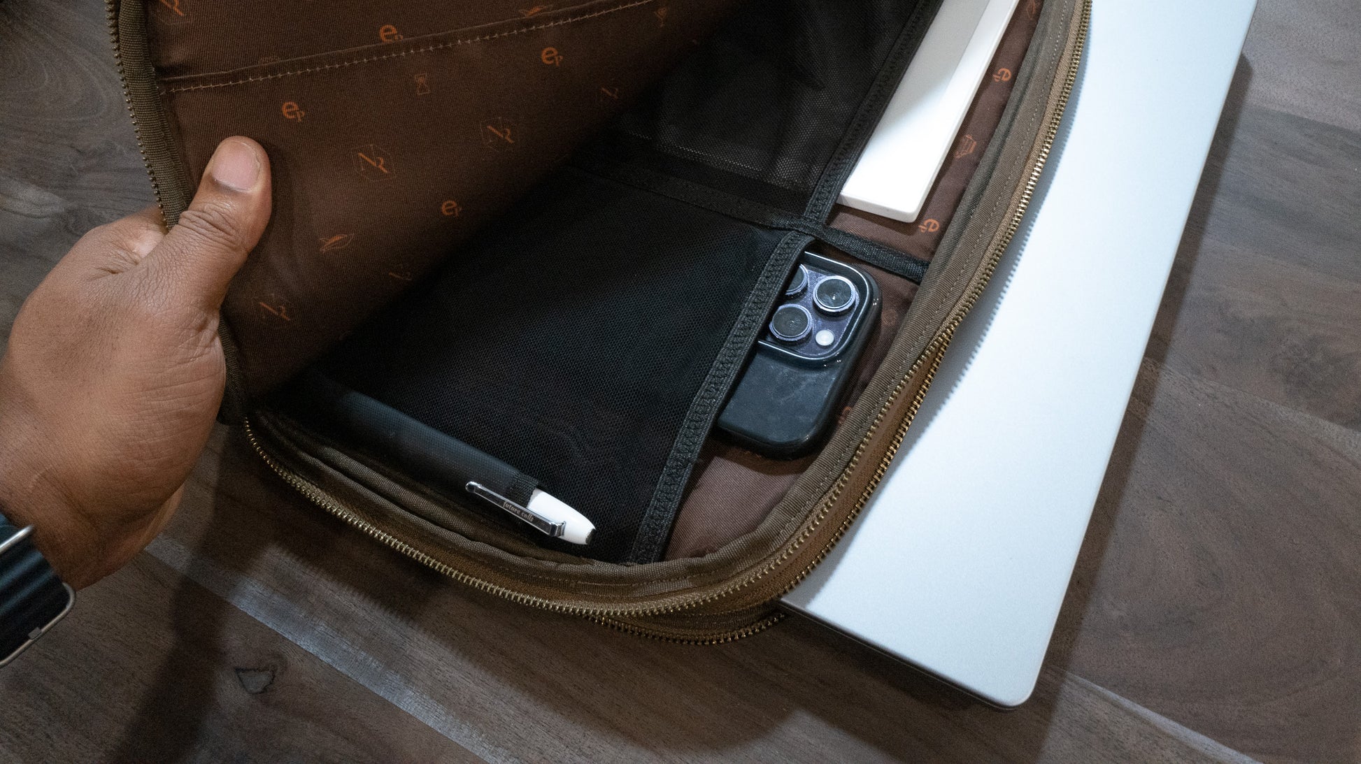 It can fit multiple tablets and phones in the front pocket and also a large laptop in the rear pocket.