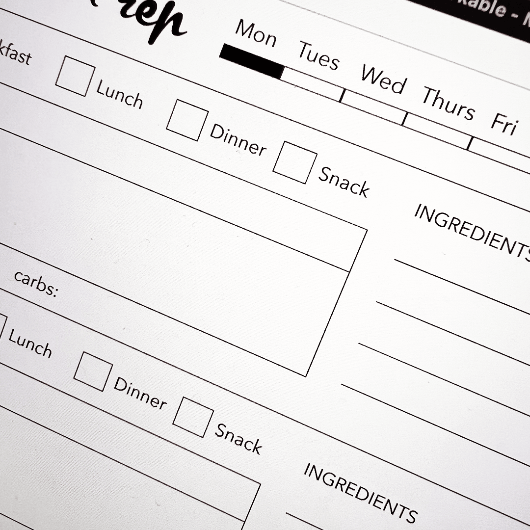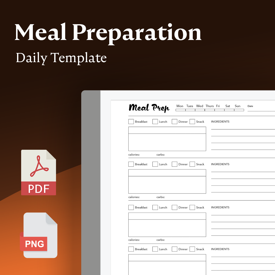 Meal preparation template that will help you keep your meals organized throughout the week. Fill in the day of week, meal, ingredients and other helpful information to keep you living a healthy and organized life.